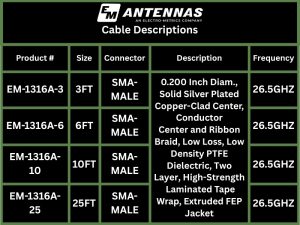 The EM-1316A Series are cables in 6, 10 or 25ft with SMA male to SMA male connectors on both ends. These are low-loss, high-performance, which covers the frequency range from DC to 26.5GHZ. These are ruggedized and armored for durability and stability.